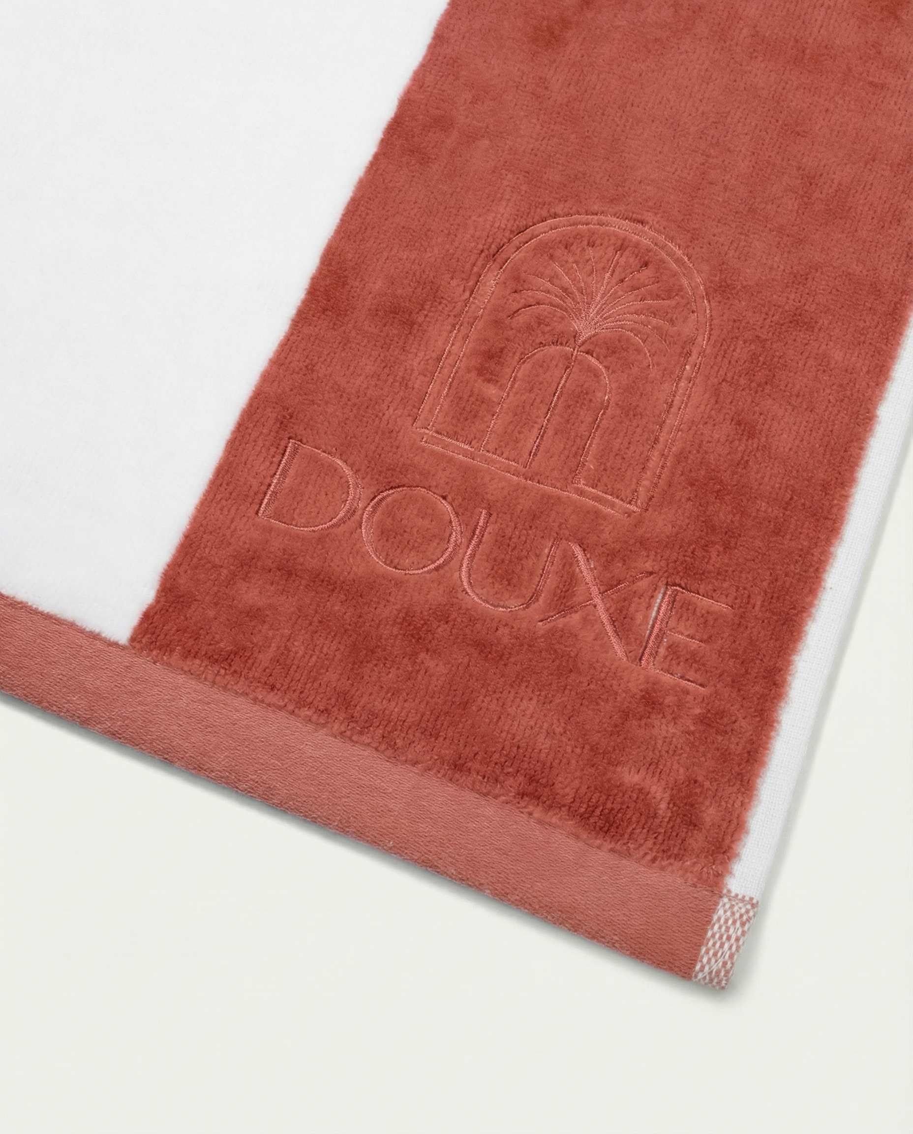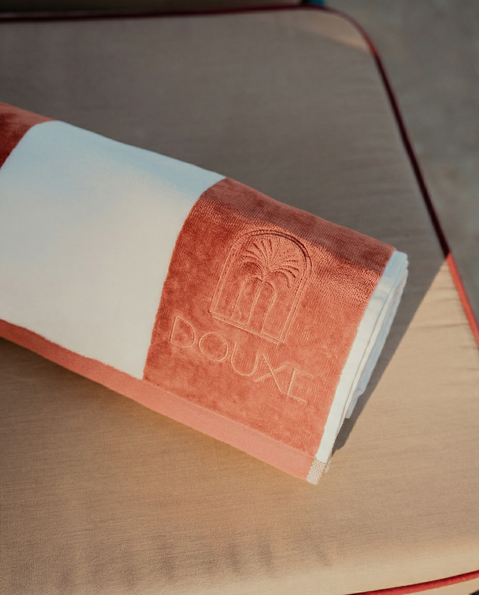 Indulge in pure luxury with the DOUXE beach towel in Faded Coral. The warm, soft tone is inspired by the sun-drenched atmosphere of Son Vida in Mallorca, where long, light-filled days flow seamlessly into moments of refined relaxation. Its subtle hue and airy softness bring this serene experience to every moment at the beach or by the pool.