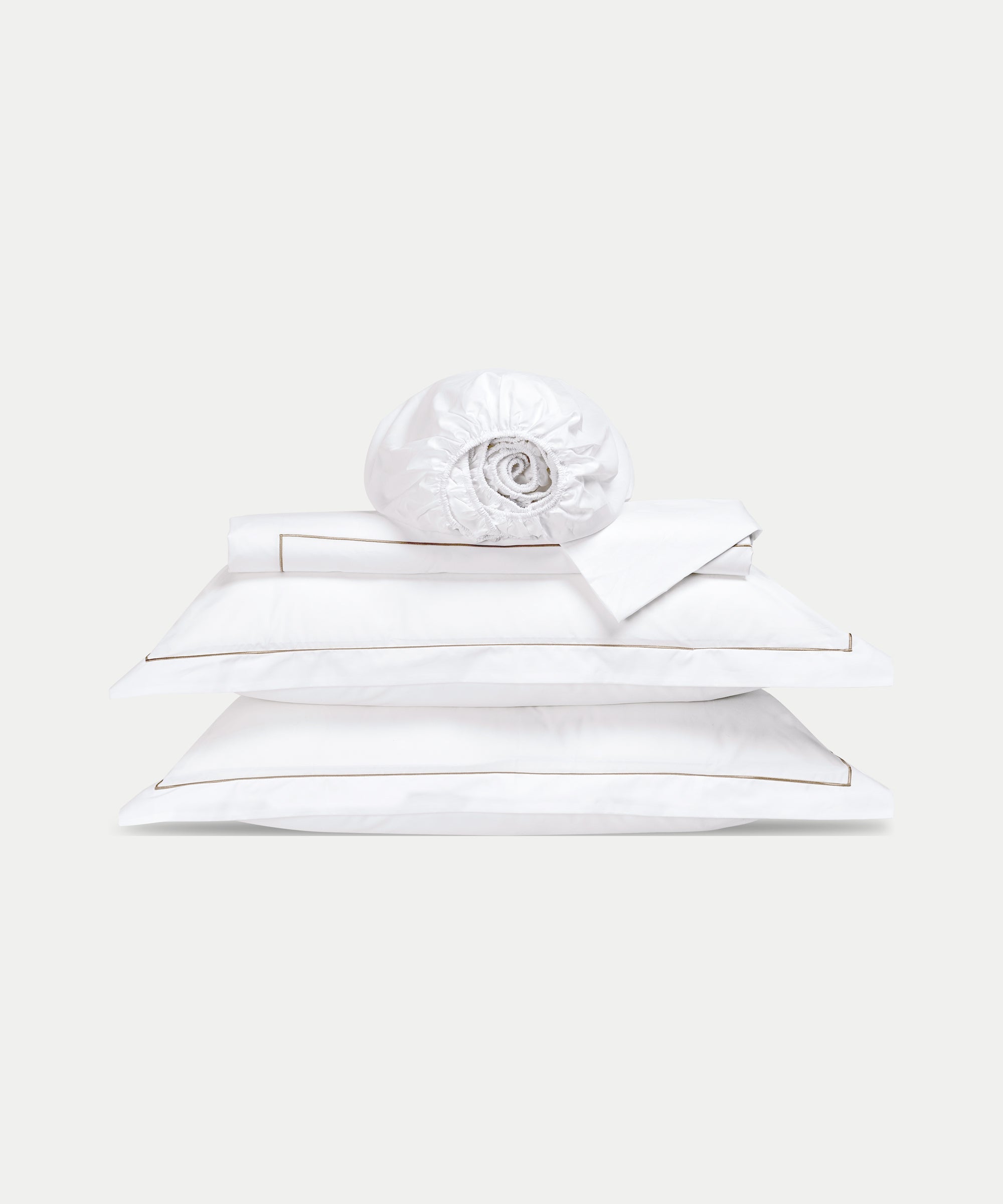 Transform your bedroom into a serene oasis of calm and refinement with this complete Carmel White percale set.