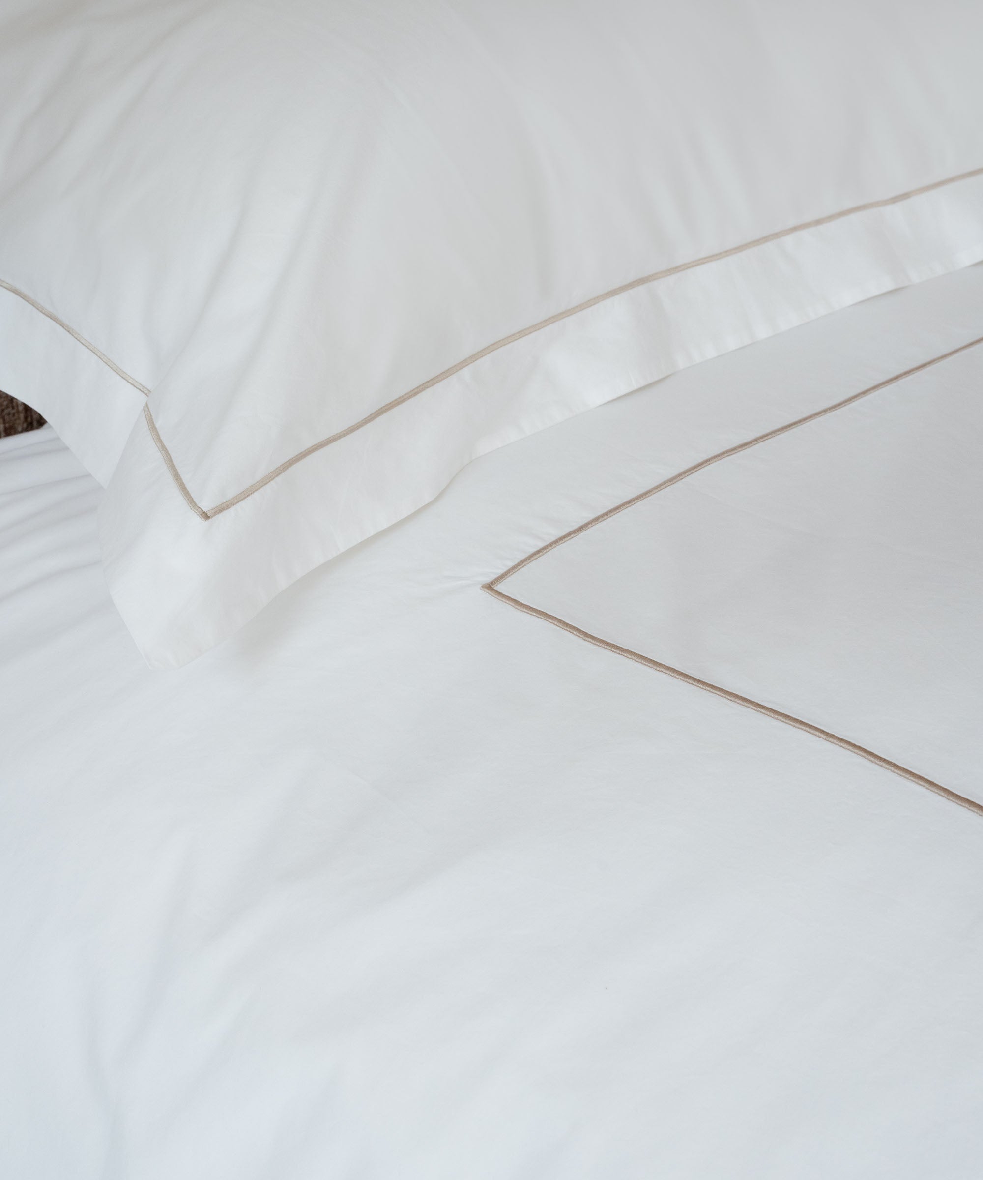 Experience the freshness and luxury of this Egyptian cotton percale set in a warm, refined shade: Carmel White. This soft white tone with a subtle warm undertone brings an elegant hotel-style atmosphere to the bedroom, offering a timeless and tranquil appearance.
