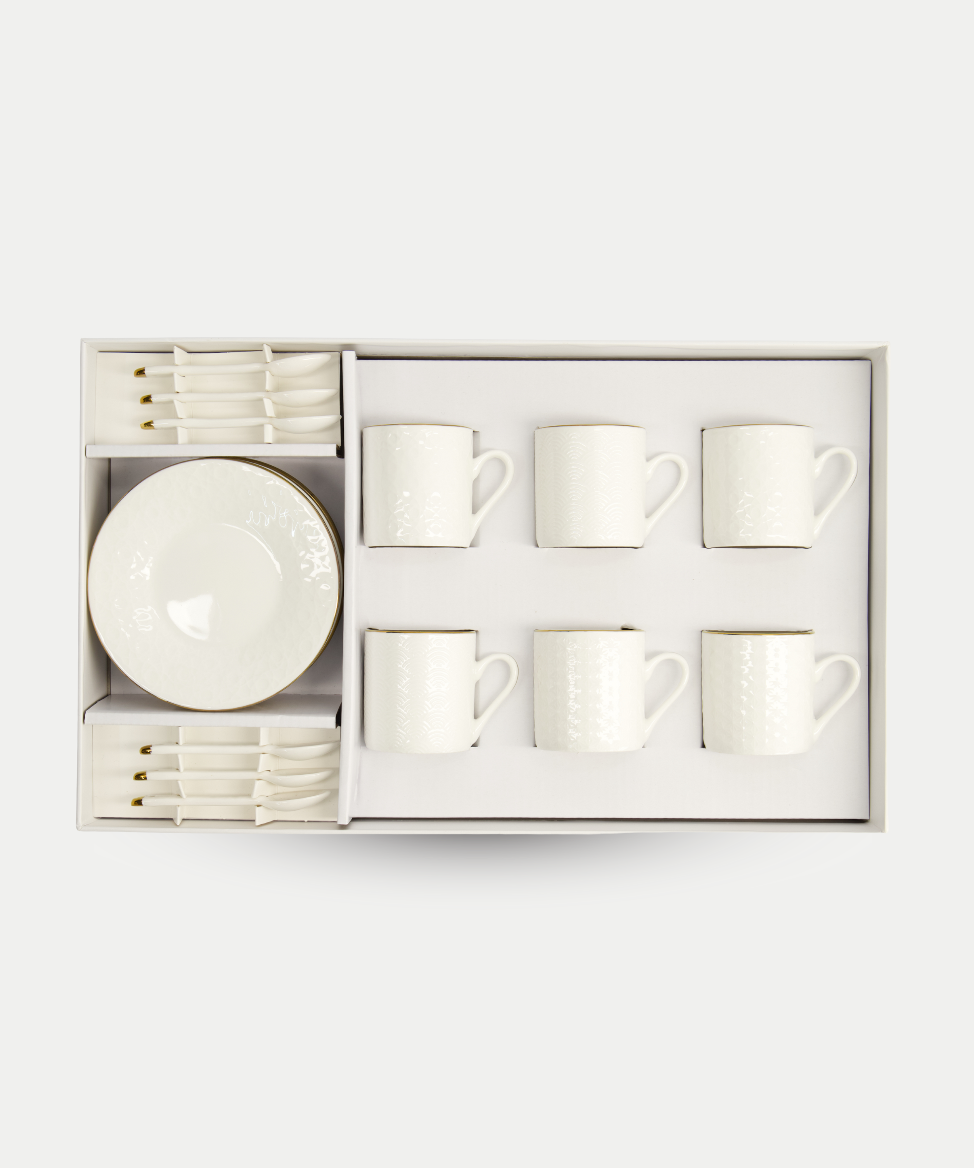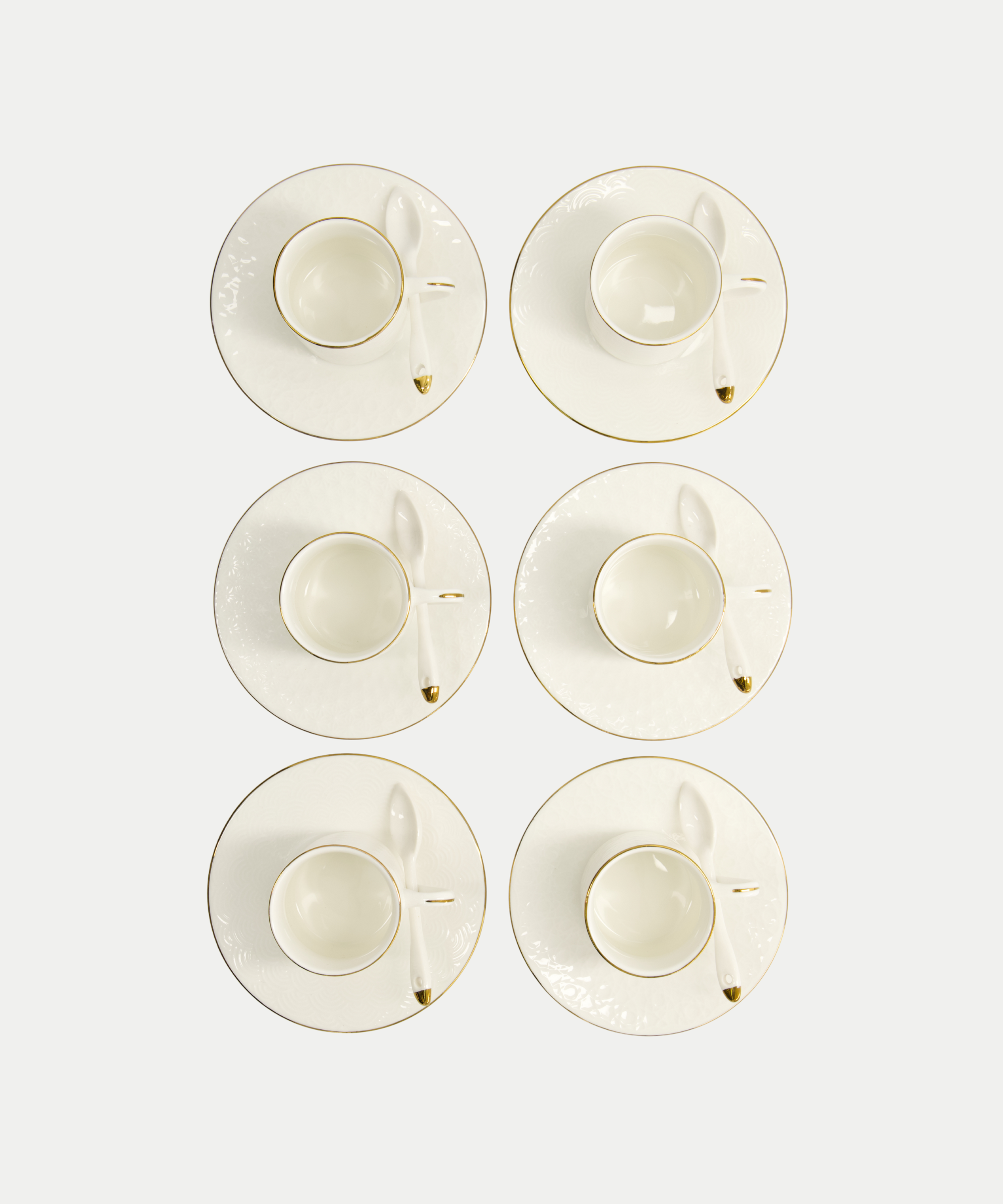 Enjoy your espresso in style with the Nippon White Gold Rim Espresso Set. This luxurious 18-piece set includes six porcelain espresso cups, each paired with a matching saucer and spoon. Every piece is crafted from high-quality porcelain and finished with a delicate gold rim, creating an elegant and timeless look.